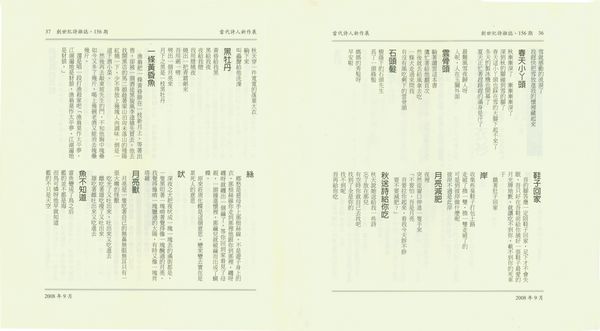 | 關鍵字: | 清明;太陽輸掉了衣衫;沙子;胸衣;雪兒;春天小ㄚ頭;雲骨頭;石頭髮;鞋子回家;岸;月亮減肥;秋送詩給你吃;黑牡丹;一條黃昏魚;絲;吠;月亮獸;魚不知道;蘇曼殊的草鞋-即之到得原無事。始知枉費草鞋錢。李白是青蛙;糞做的歷史;瀑布斬;北風;月亮這位理髮師;傅園的六隻松鼠 |